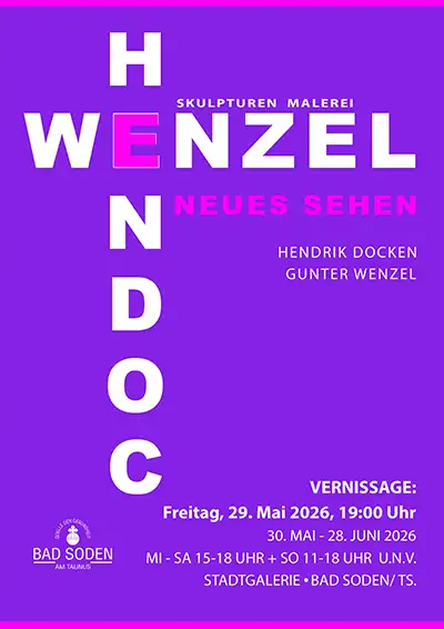 Aktuelles Skulpturen & Malerei – AUSSTELLUNG Stadtgalerie Bad Soden Hendrik Docken und Gunter Wenzel30.05. – 28.06. 2026Vernissage – Freitag, 29.5.26, 19 Uhr
